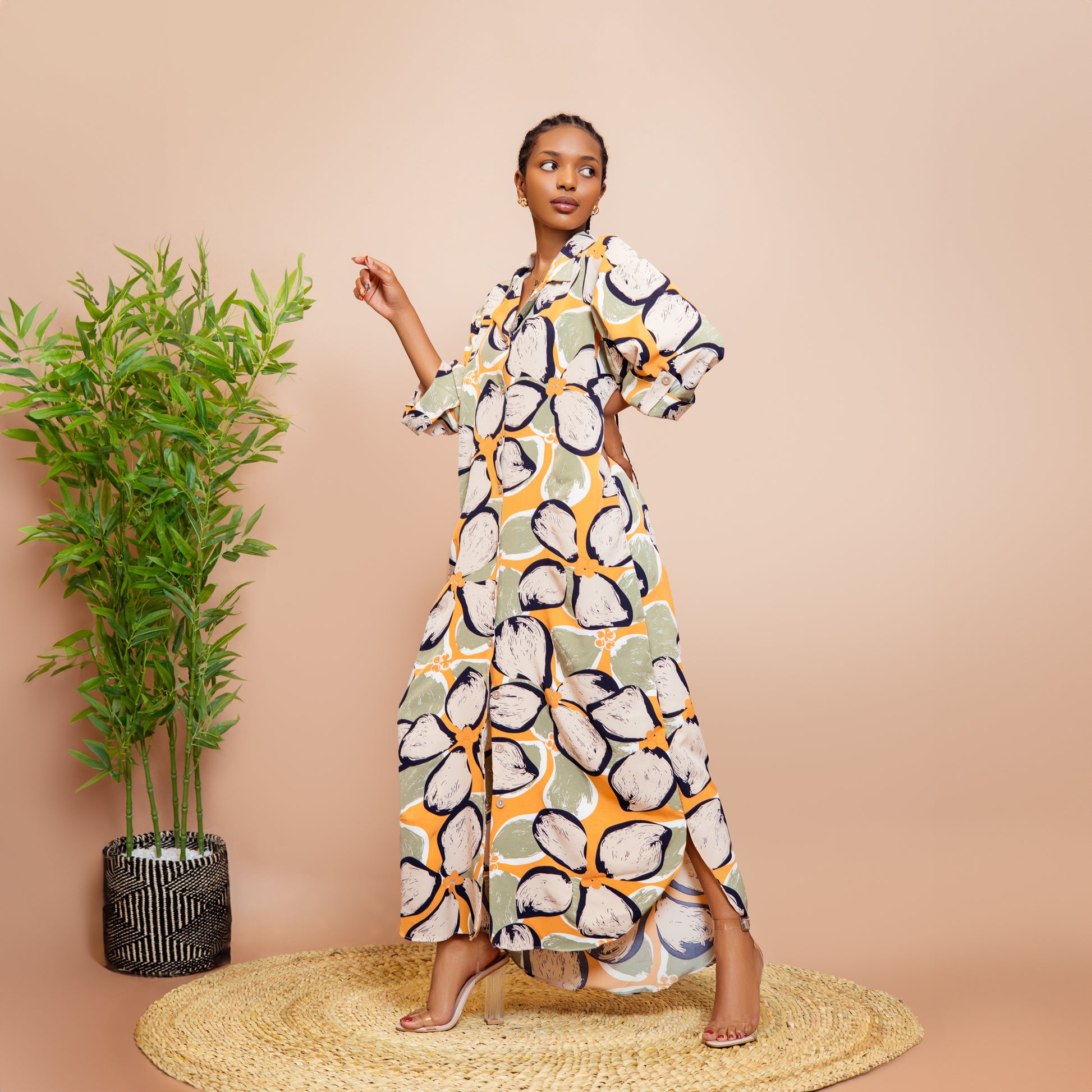 Tropical Floral Scalloped Hem Maxi Dress - Olive Green/Mustard