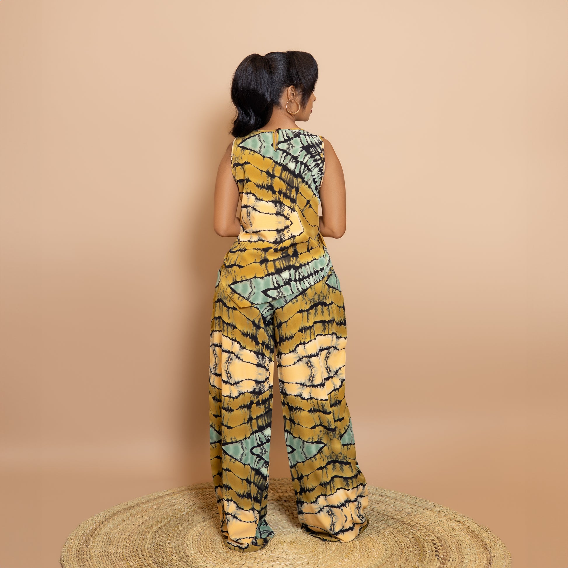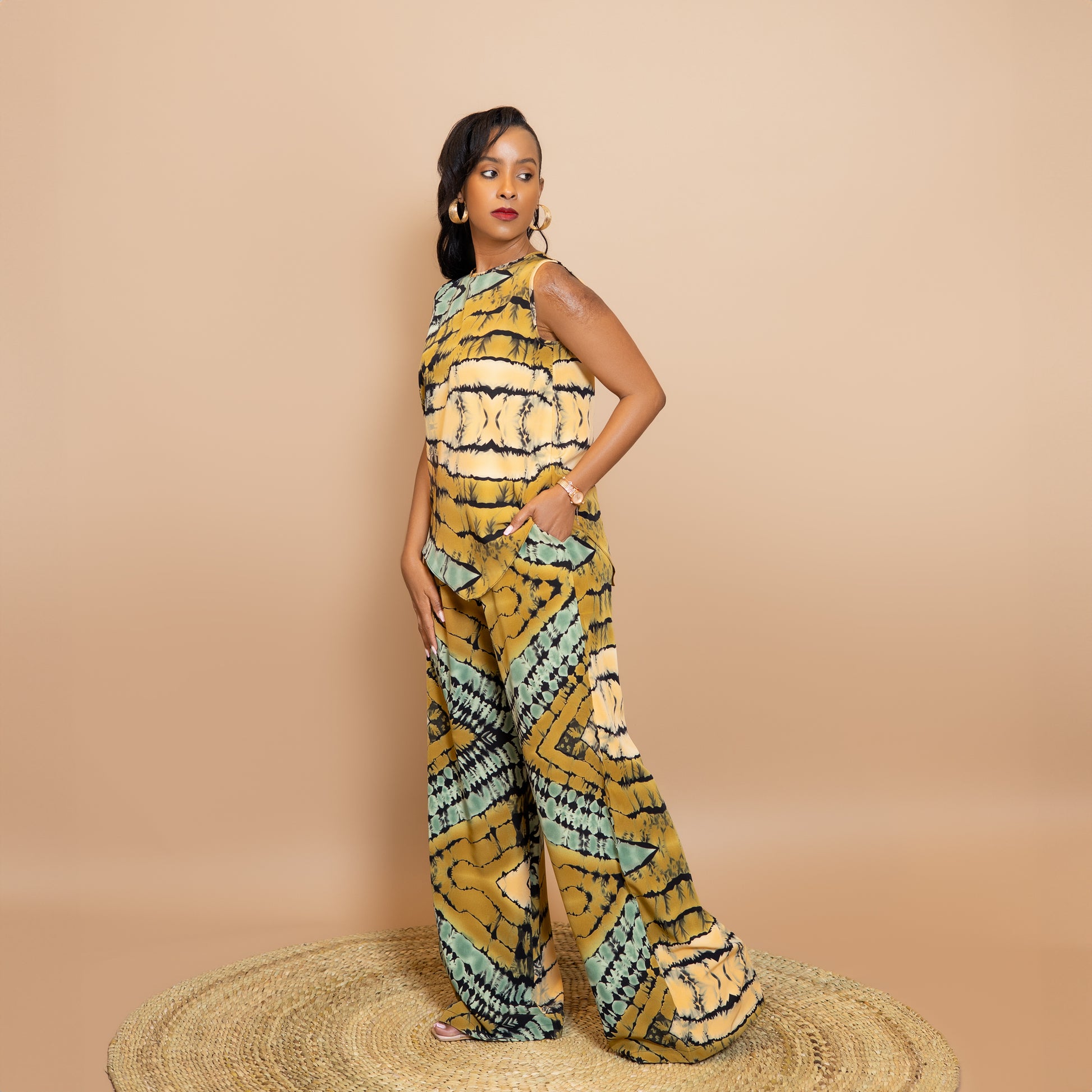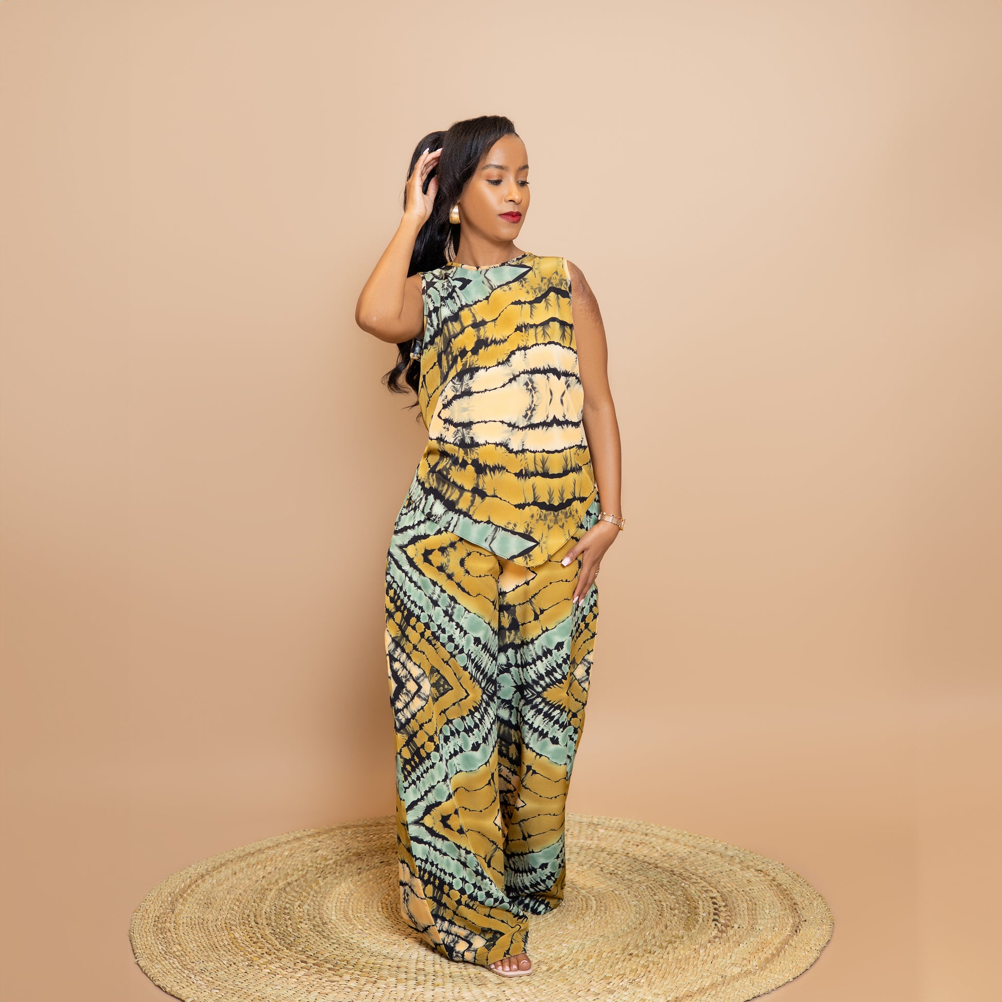 Details: Two-piece set with an asymmetrical sleeveless top and wide-leg palazzo pants in a bold print with earthy tones. The top features an angled hemline; the pants feature an elastic waist and functional side pockets.