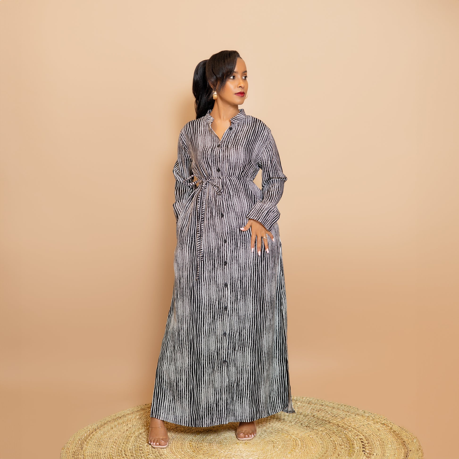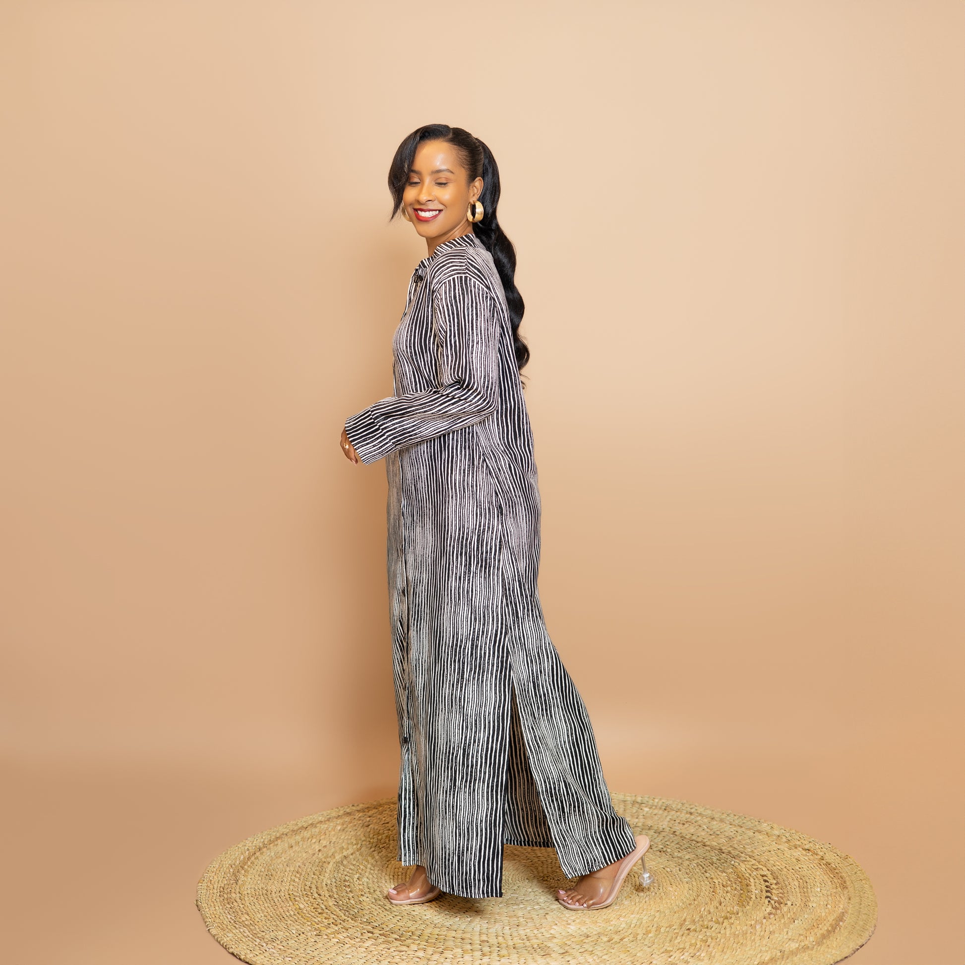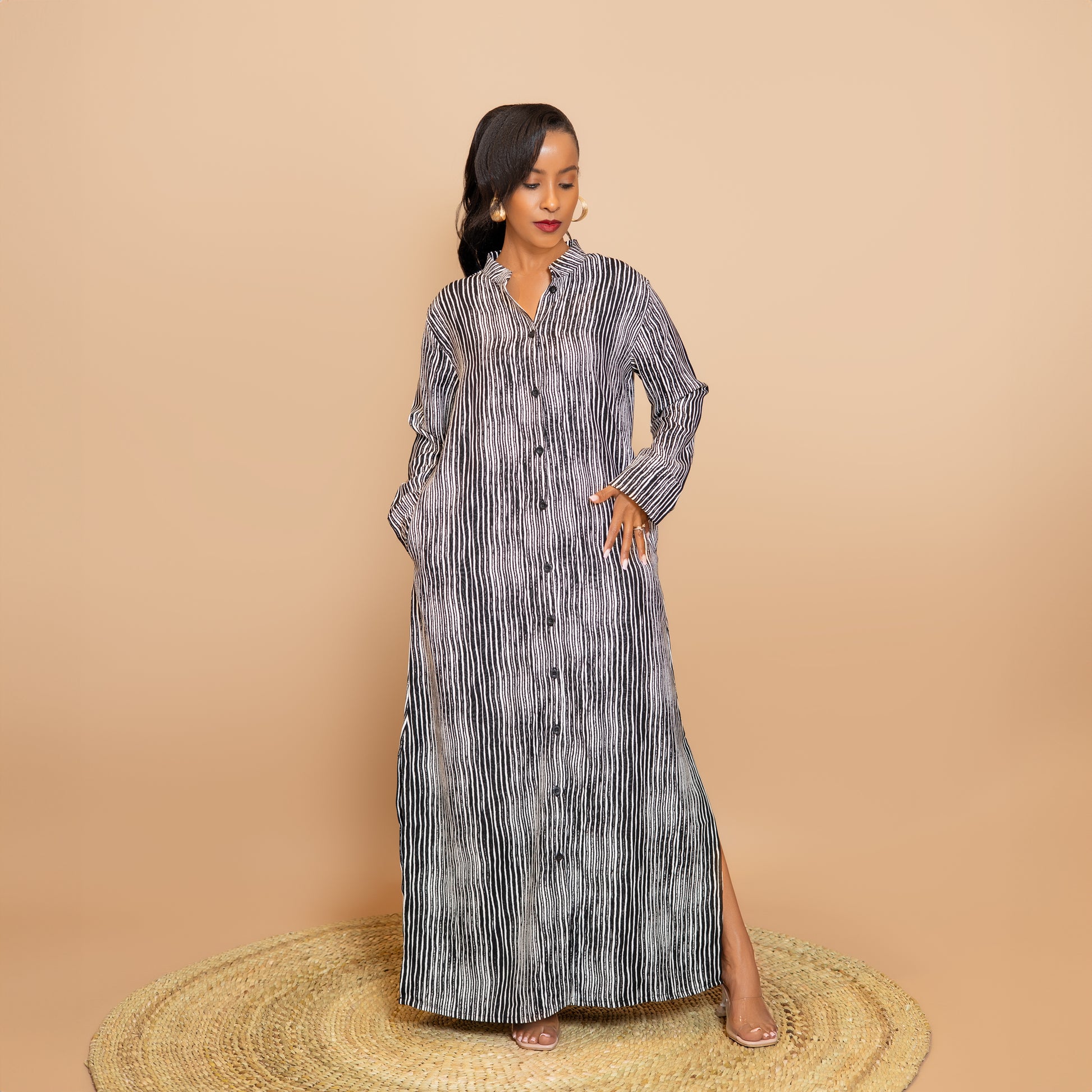 Details: Maxi button-down shirt dress featuring a mandarin collar, full button-down front, and long sleeves. Has a straight silhouette, side slits for ease of movement and functional side pockets. Comes with a matching belt for optional waist definition.