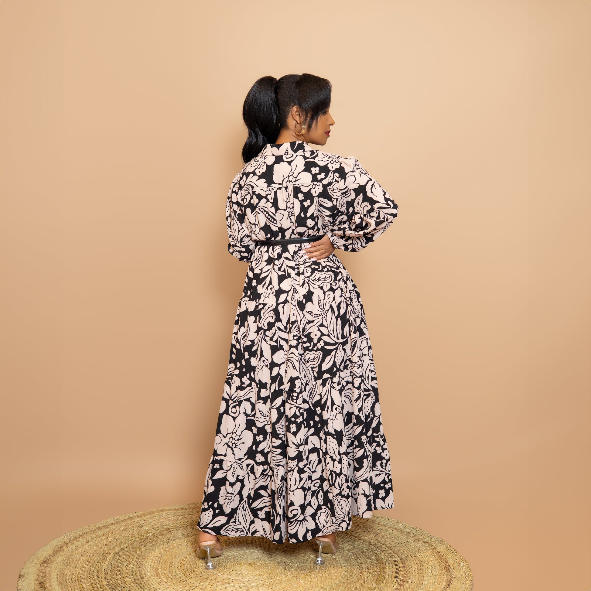Details: Maxi shirt dress featuring a collared neckline, button-down front, and long sleeves with cuffed finish. Designed in a flowy tiered silhouette with an all-over ivory floral print on a black base. Can be styled loose or cinched at the waist with a belt (sold separately).