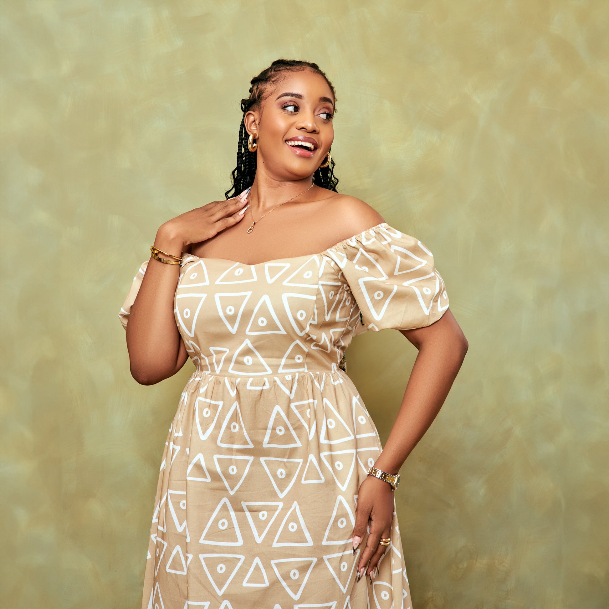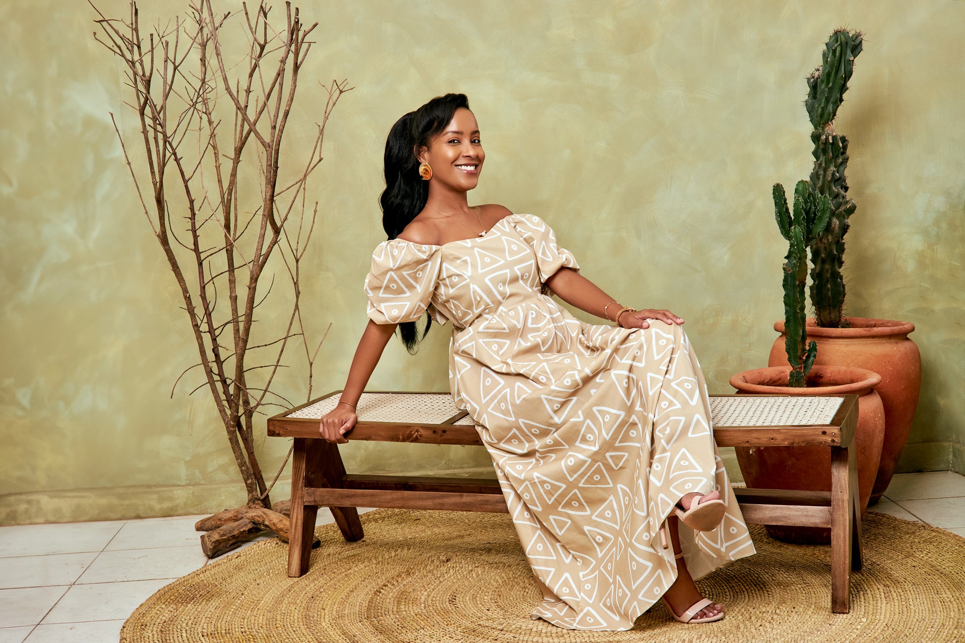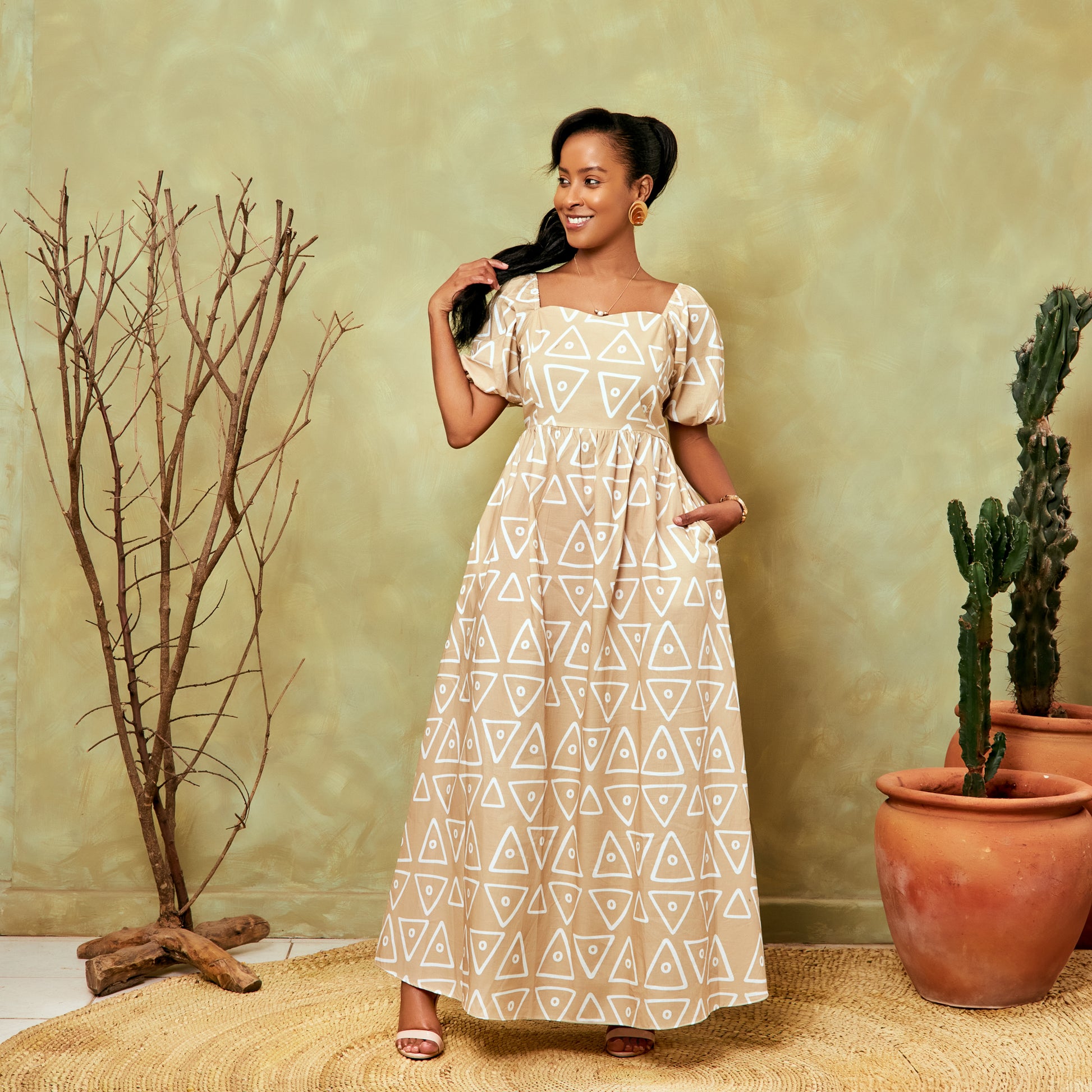 Details: Elegant maxi dress featuring a flattering sweetheart neckline with elasticated puff sleeves and a striking bow-tie back. Designed in a structured cotton fabric that holds its shape beautifully while allowing comfort. The print was developed in-house, a Nalani original.