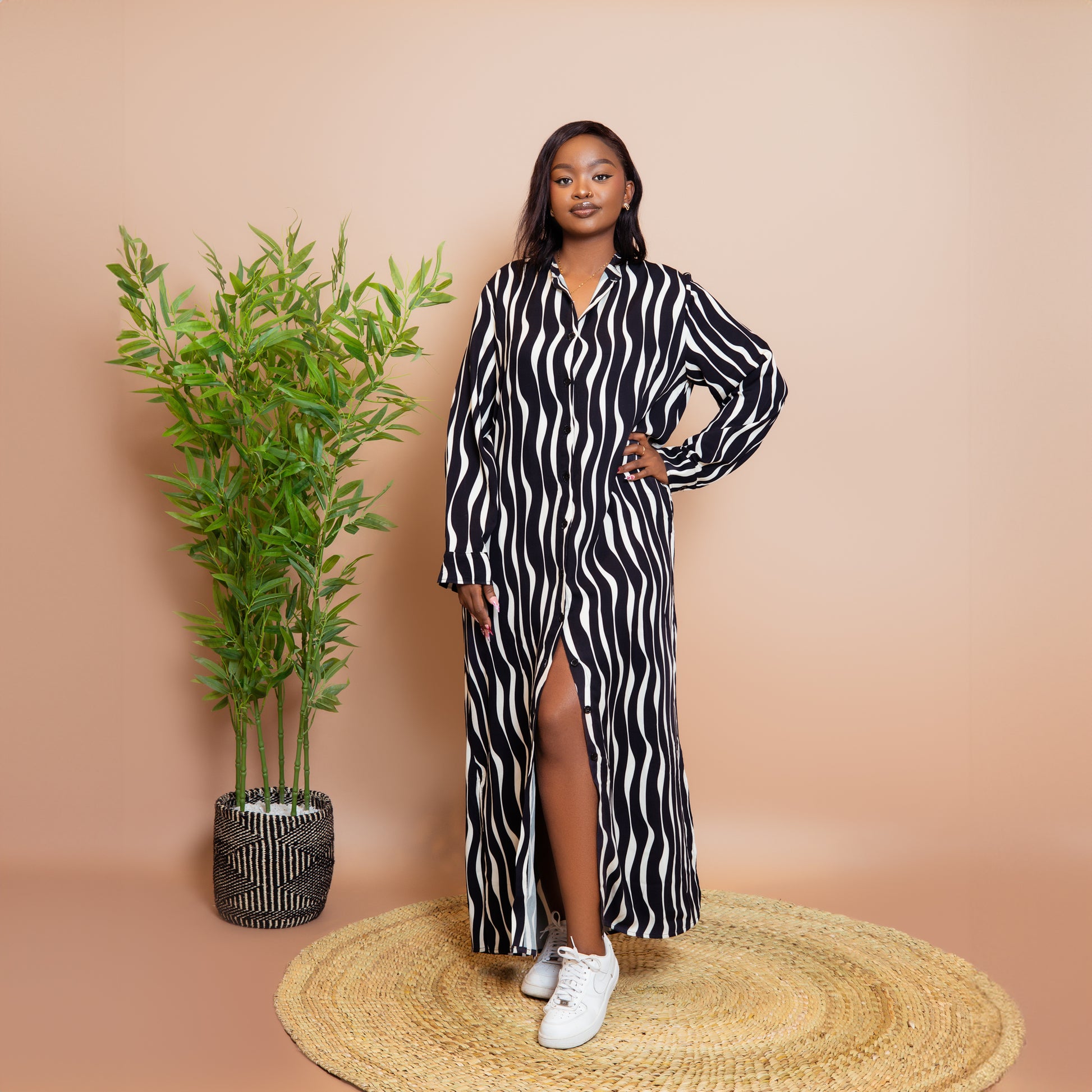 Nia Wavy Stripe Maxi Shirt Dress - Black