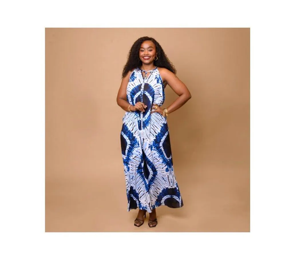 Details: Sleeveless maxi dress featuring an adjustable front keyhole tie detail, functional side pockets and a flowy A-line silhouette. Designed in a lightweight, breathable fabric perfect for sunny days, and featuring a blue tie-dye pattern.