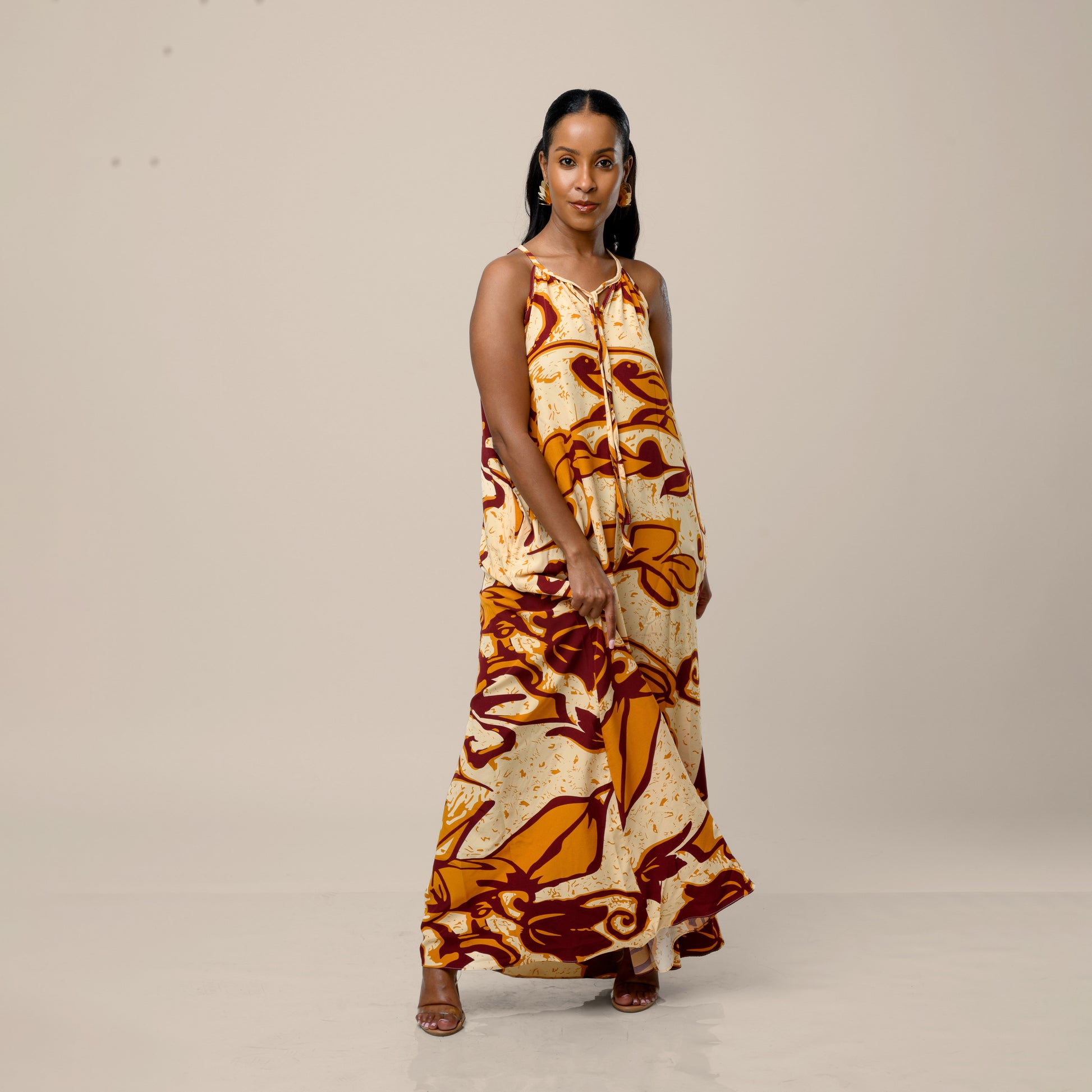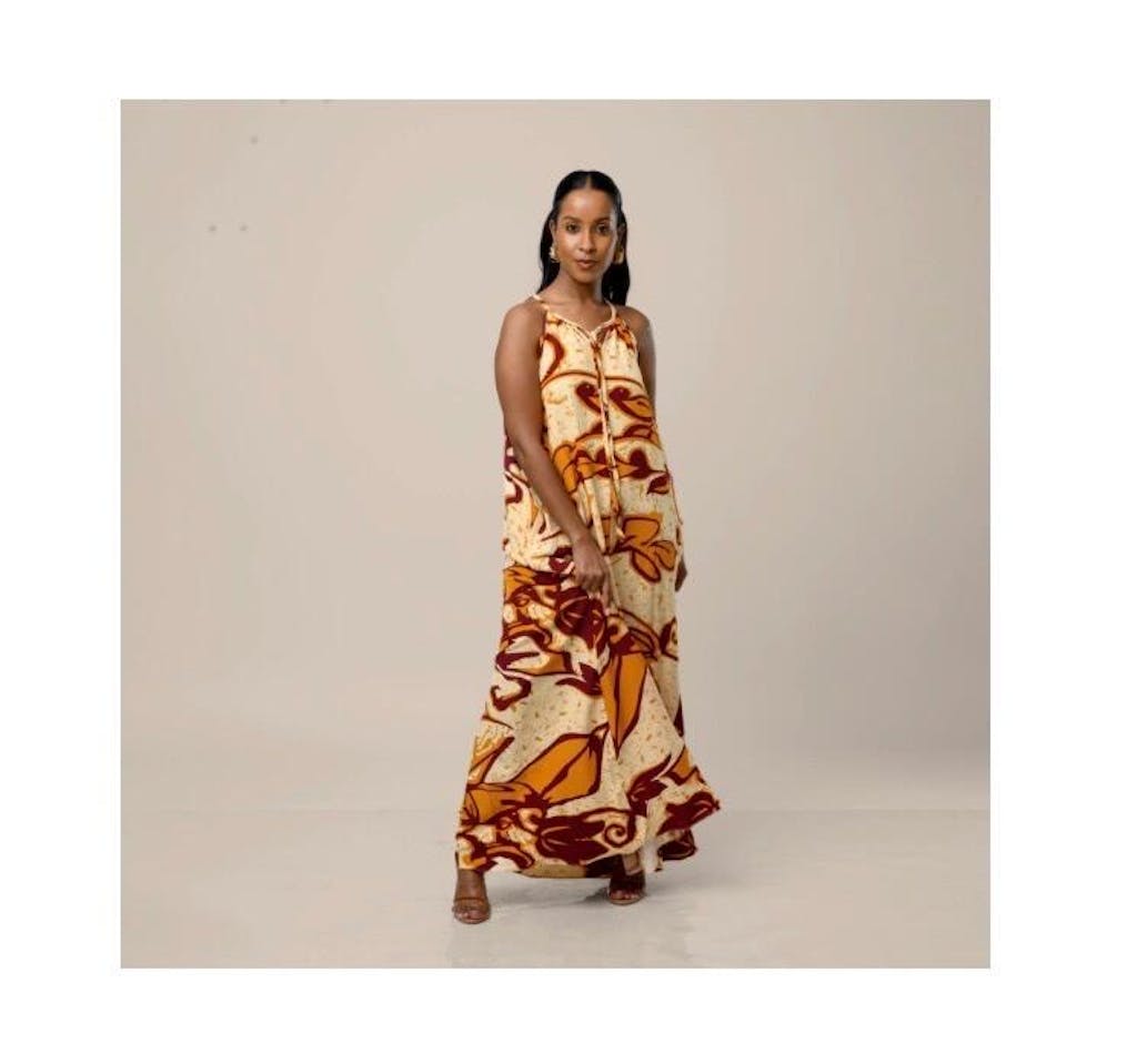 Details: Sleeveless maxi dress featuring a front keyhole tie detail and functional side pockets. Designed with a relaxed, flowy silhouette that drapes beautifully on the body, offering ease and movement while remaining effortlessly elegant.