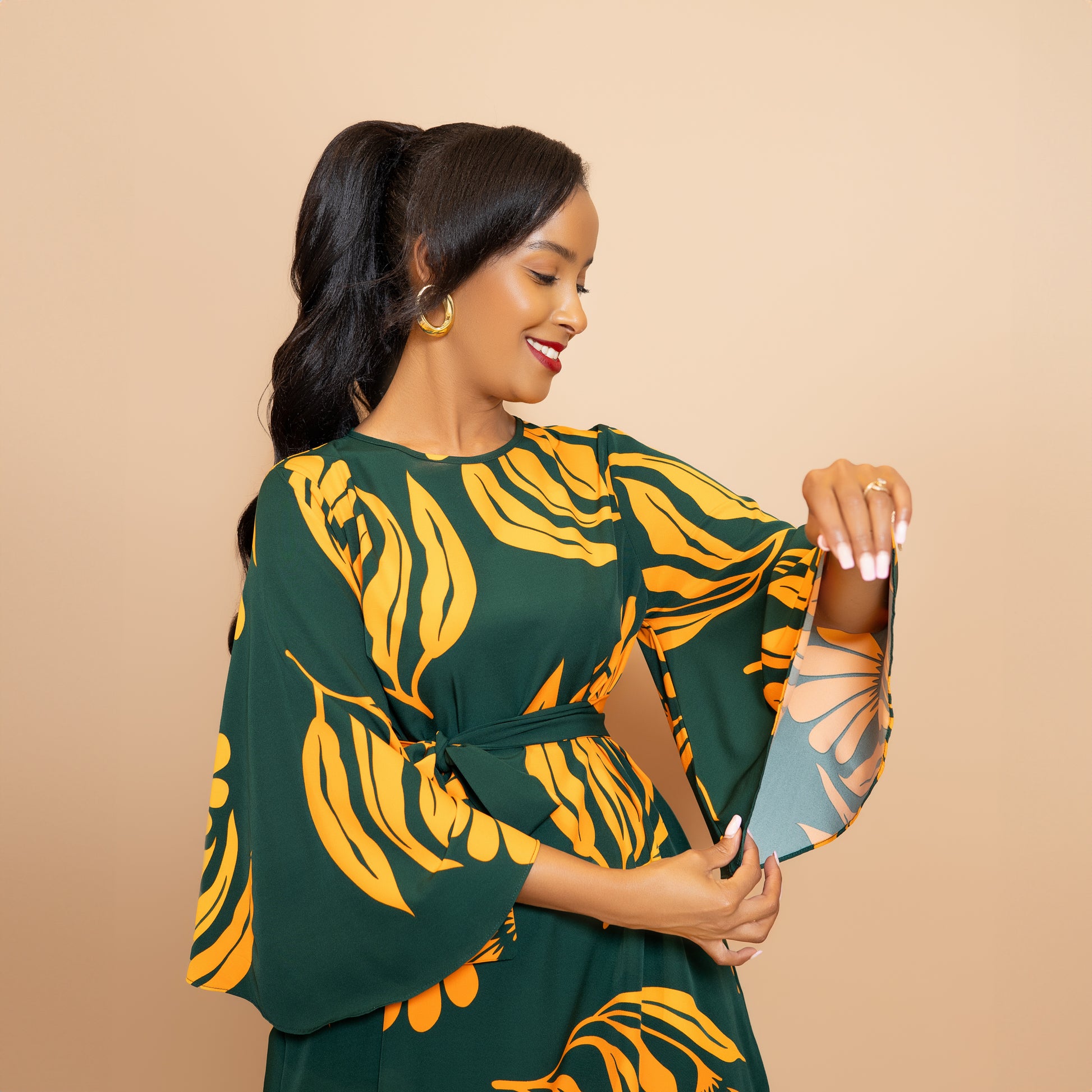 Details: Dress featuring dramatic trumpet sleeves and bold green botanical print. Designed in a tent silhouette with a matching belt for optional waist definition, allowing it to be worn belted or free for a relaxed fit.
