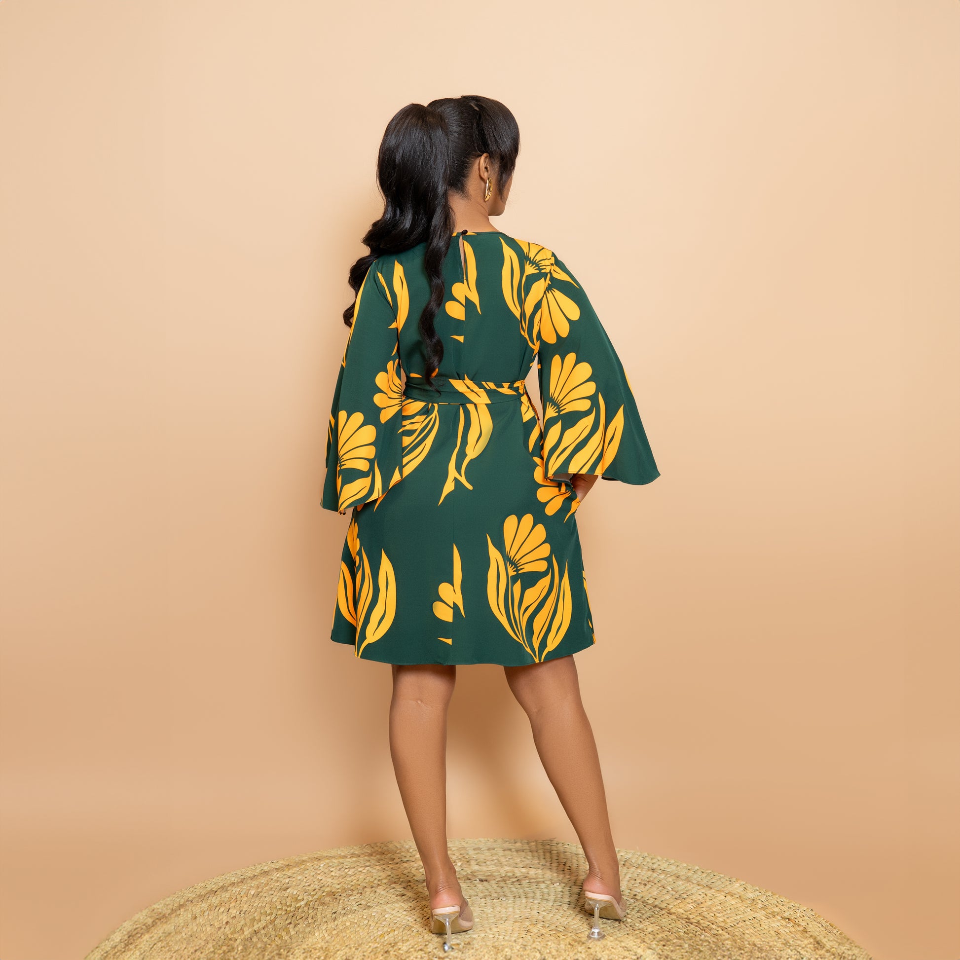 Trumpet Sleeve Botanical Print Dress - Green/Mustard